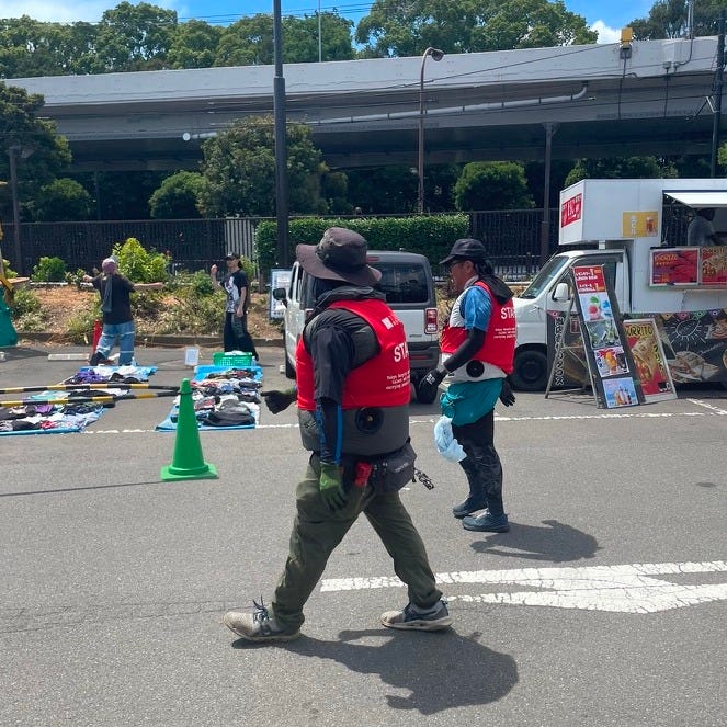 Agents de maintenance au marché aux puces de Tokyo (40 degrés à l’ombre). Notez les ventilateurs ronds à l’arrière de leur veste.
