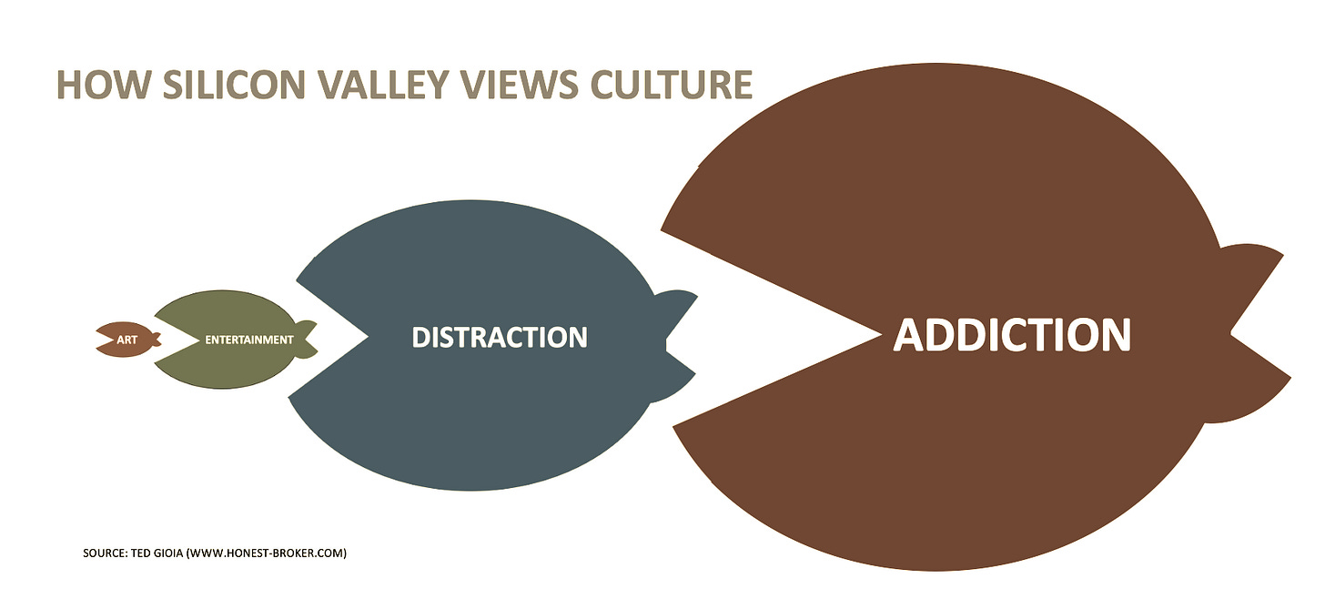 L’année dernière Ted Gioia signait un magistral “L’état de la culture, ou un aperçu de la société post-divertissement (ce n’est pas joli)”. Le critique de jazz y démontrait comment l’art avait été dévoré par étapes successives : art > divertissement > distraction > addiction avec le scrolling de courtes vidéos devenu l’alpha et l’omega de la diffusion des oeuvres (des “contenus” pardon). Les moyens de diffusion sont concentrés entre quelques géants du web qui veulent conserver jalousement leur “audience” en pénalisant toute référence extérieure, réduisant à néant ce qui faisait l’intérêt premier du web : la découverte de nouveaux domaines à l’aide des liens hypertextes et autre #hashtags.