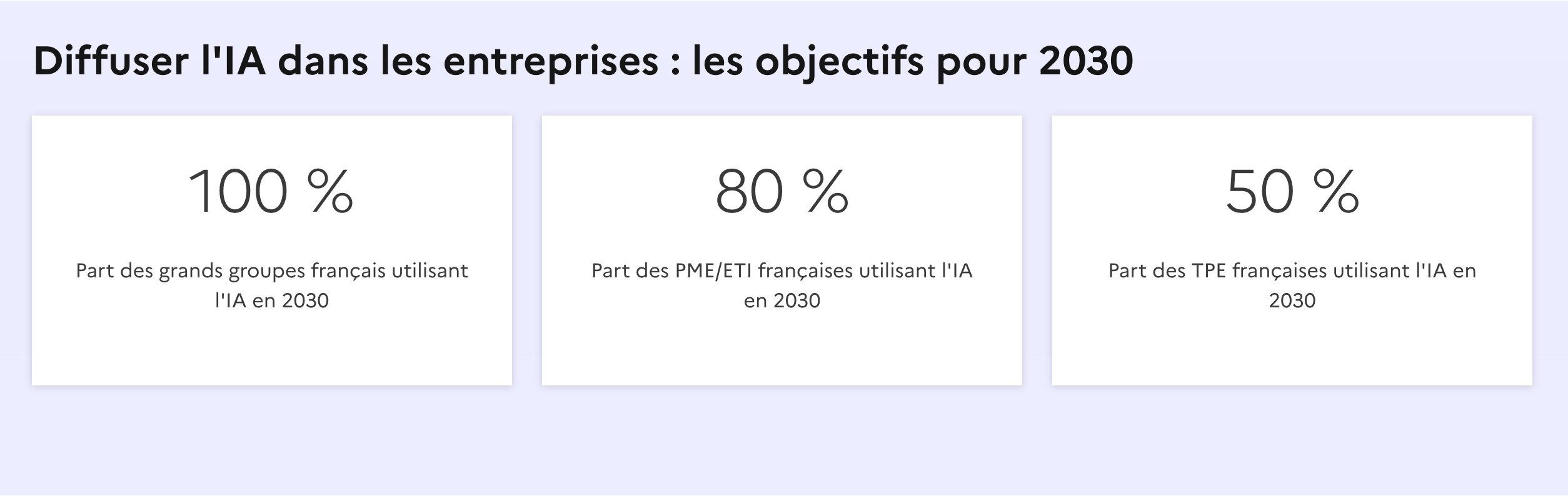 Quant à la démarche gouvernementale “Osez l’IA”, elle vise à former “15 millions de professionnels en 2030” soit 1 actif sur 2, avec des objectifs d’usage allant de 100% des grandes entreprises à 50% pour les TPE.