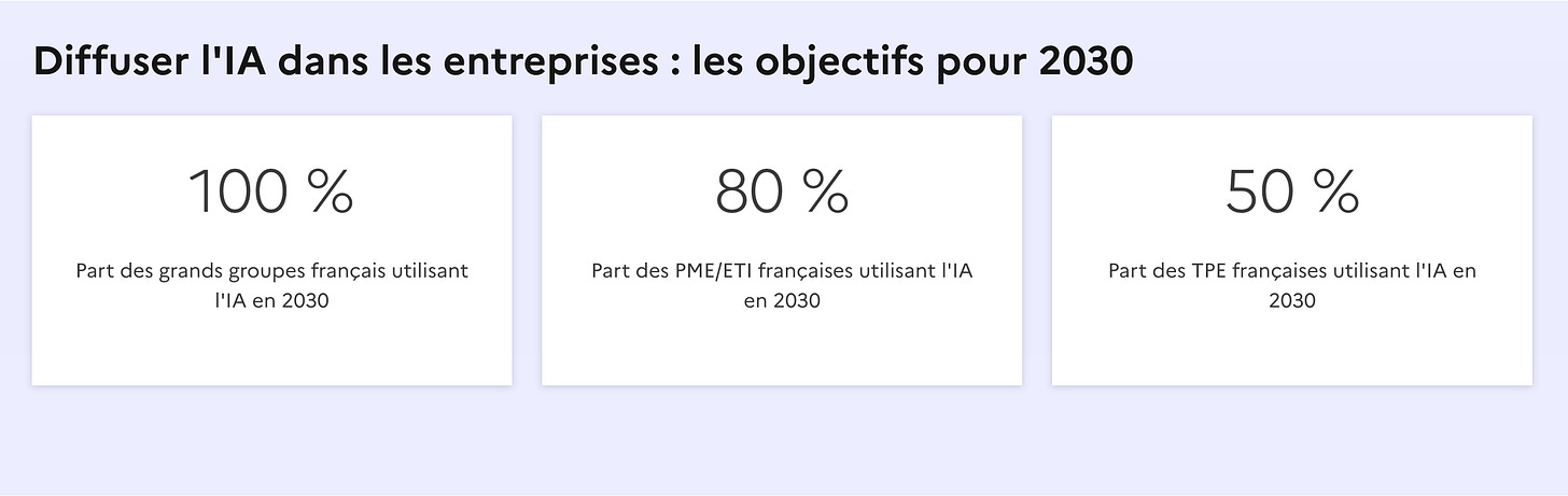 Je n’ai pas pour habitude de commenter les politiques publiques2, donc je me contenterai de parier ici que cette segmentation des objectifs ne se vérifiera pas dans le cas de l’IA. J’imagine qu’elle correspond à la précédente vague d’adoption des sites internet des années 2000 : de grandes entreprises pionnières et des PME/TPE à la traîne de la “transformation numérique”. Dans le cas des IA génératives, j’imagine l’exact inverse : des petites entreprises sans DSI qui adopteront rapidement les usages courants de l’IA “grand public”, avec des coûts très faibles et des barrières à l’entrée peu élevées. La nouvelle génération qui aura appris à s’en servir durant ses études ne va pas l’abandonner à l’entrée du bureau.